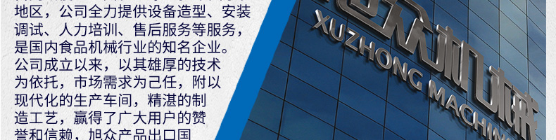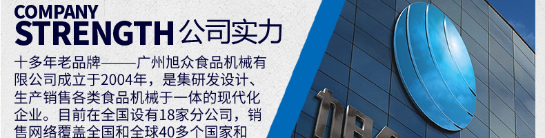 廣州旭眾食品機械有限公司是一家集科研開發(fā),生產(chǎn)設(shè)計,營銷服務(wù)為一體的現(xiàn)代化生產(chǎn)企業(yè)。現(xiàn)代化生產(chǎn)車間,精湛制造技術(shù),所產(chǎn)機械歷經(jīng)市場重重考驗,不斷贏得海內(nèi)外客戶的贊譽。