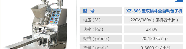 XZ-86S型雙餡斗全自動包子機,可生產(chǎn)各種肉包、肉菜包、菜包、小籠包、湯包、水晶包、圓饅頭、奶黃包、豆沙包、叉燒包、南瓜餅等幾十種包餡制品。適用于賓館、飯店、學校、機關企業(yè)食堂、饅頭或包子加工廠、早餐工程店及速凍食品廠等單位??蓾M足不同客戶群體。免費提供工藝技術。免費上門培訓指導安裝。