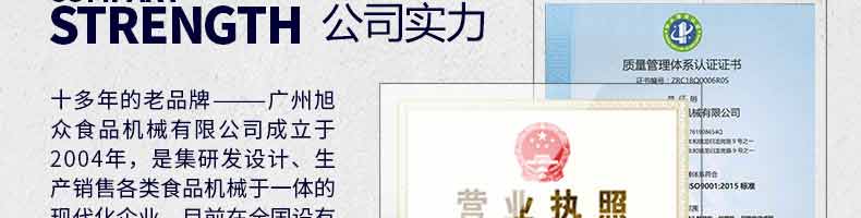 廣州旭眾食品機械有限公司是一家集科研開發(fā),生產(chǎn)設計,營銷服務為一體的現(xiàn)代化生產(chǎn)企業(yè)?,F(xiàn)代化生產(chǎn)車間,精湛制造技術,所產(chǎn)機械歷經(jīng)市場重重考驗,不斷贏得海內(nèi)外客戶的贊譽。