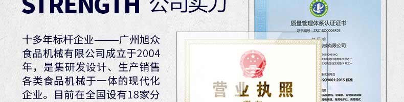 廣州旭眾食品機(jī)械有限公司是一家集科研開(kāi)發(fā),生產(chǎn)設(shè)計(jì),營(yíng)銷(xiāo)服務(wù)為一體的現(xiàn)代化生產(chǎn)企業(yè)。現(xiàn)代化生產(chǎn)車(chē)間,精湛制造技術(shù),所產(chǎn)機(jī)械歷經(jīng)市場(chǎng)重重考驗(yàn),不斷贏得海內(nèi)外客戶的贊譽(yù)。