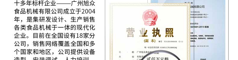 廣州旭眾食品機械有限公司是一家集科研開發(fā),生產(chǎn)設計,營銷服務為一體的現(xiàn)代化生產(chǎn)企業(yè)?,F(xiàn)代化生產(chǎn)車間,精湛制造技術,所產(chǎn)機械歷經(jīng)市場重重考驗,不斷贏得海內外客戶的贊譽。