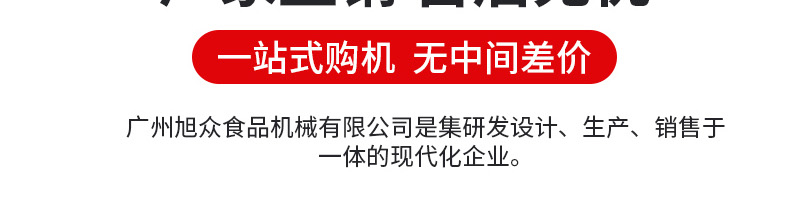 廣州旭眾食品機(jī)械有限公司是一家集科研開發(fā),生產(chǎn)設(shè)計(jì),營銷服務(wù)為一體的現(xiàn)代化生產(chǎn)企業(yè)?,F(xiàn)代化生產(chǎn)車間,精湛制造技術(shù),所產(chǎn)機(jī)械歷經(jīng)市場重重考驗(yàn),不斷贏得海內(nèi)外客戶的贊譽(yù)。