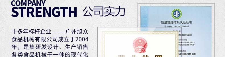 廣州旭眾食品機械有限公司是一家集科研開發(fā),生產(chǎn)設計,營銷服務為一體的現(xiàn)代化生產(chǎn)企業(yè)?,F(xiàn)代化生產(chǎn)車間,精湛制造技術,所產(chǎn)機械歷經(jīng)市場重重考驗,不斷贏得海內(nèi)外客戶的贊譽。