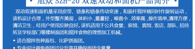 SZH-20型雙速雙動和面機(jī),本機(jī)適合攪拌各種面包、包子、饅頭、湯圓、披薩餅面團(tuán),專業(yè)設(shè)計(jì)避免面團(tuán)過分升溫并確保面團(tuán)含氧量。過載、缺相保護(hù)裝置,防護(hù)罩安全連動裝置。