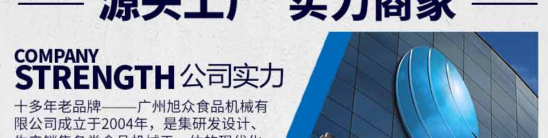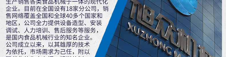 廣州旭眾食品機械有限公司是一家集科研開發(fā),生產(chǎn)設計,營銷服務為一體的現(xiàn)代化生產(chǎn)企業(yè)。現(xiàn)代化生產(chǎn)車間,精湛制造技術(shù),所產(chǎn)機械歷經(jīng)市場重重考驗,不斷贏得海內(nèi)外客戶的贊譽。