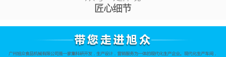 廣州旭眾食品機(jī)械有限公司是一家集科研開發(fā),生產(chǎn)設(shè)計,營銷服務(wù)為一體的現(xiàn)代化生產(chǎn)企業(yè)?,F(xiàn)代化生產(chǎn)車間,精湛制造技術(shù),所產(chǎn)機(jī)械歷經(jīng)市場重重考驗,不斷贏得海內(nèi)外客戶的贊譽(yù)。