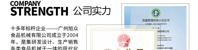廣州旭眾食品機械有限公司是一家集科研開發(fā),生產設計,營銷服務為一體的現(xiàn)代化生產企業(yè)。現(xiàn)代化生產車間,精湛制造技術,所產機械歷經市場重重考驗,不斷贏得海內外客戶的贊譽。