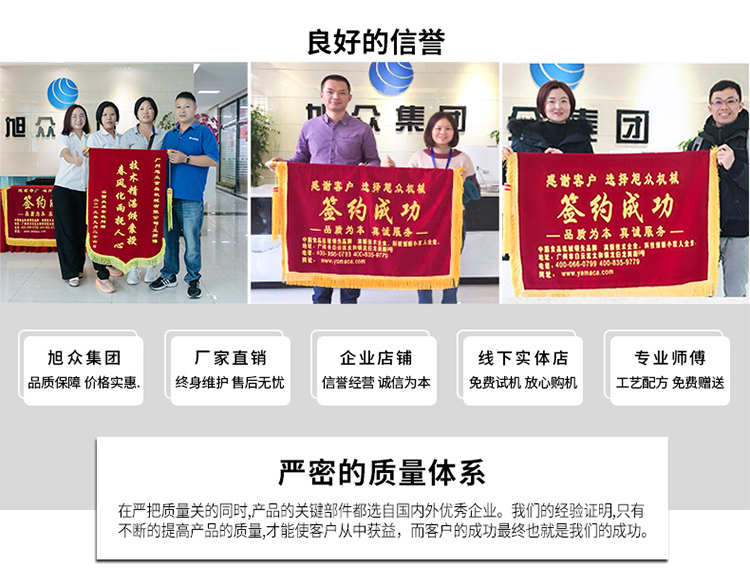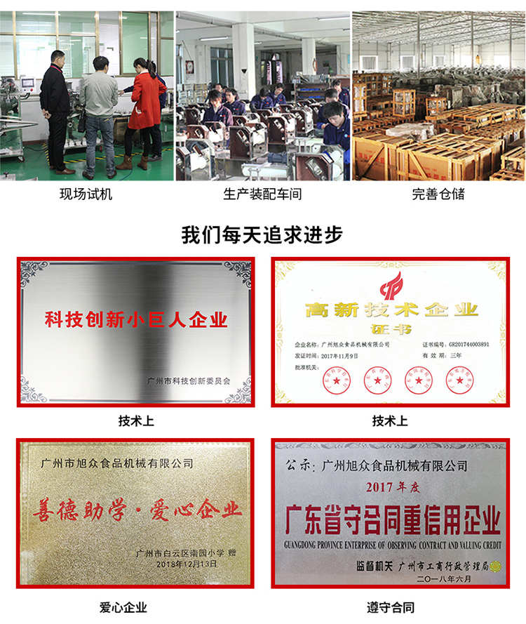 廣州旭眾食品機械有限公司是一家集科研開發(fā),生產(chǎn)設計,營銷服務為一體的現(xiàn)代化生產(chǎn)企業(yè)?,F(xiàn)代化生產(chǎn)車間,精湛制造技術,所產(chǎn)機械歷經(jīng)市場重重考驗,不斷贏得海內(nèi)外客戶的贊譽。