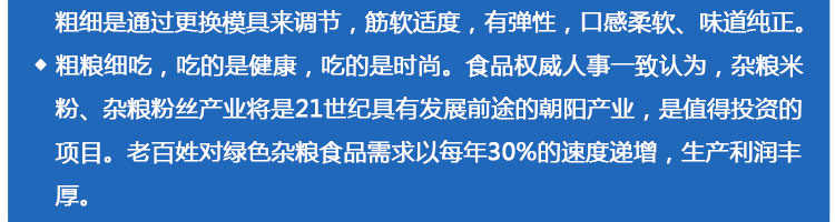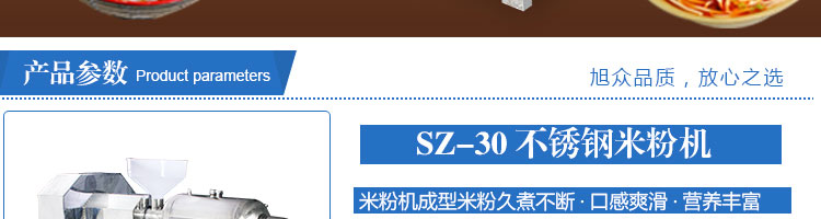 SZ-30不銹鋼米粉機,可生產(chǎn)米粉、米線、桂林米粉、過橋米線、年糕、糍粑等產(chǎn)品。各種形狀都可生產(chǎn)(圓、扁),加工食品外表光滑,厚薄、寬窄、粗細(xì)均勻可調(diào),筋軟適度,有彈性,口感柔軟、味道純正。