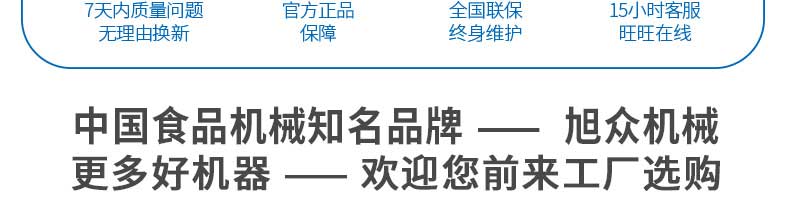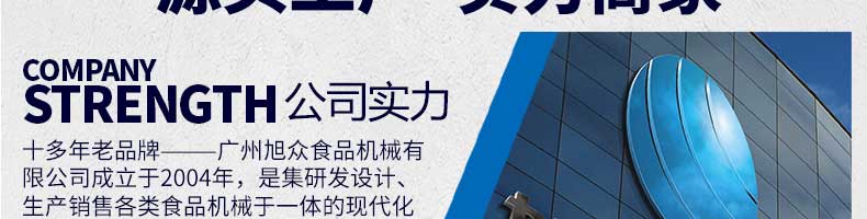 廣州旭眾食品機(jī)械有限公司是一家集科研開發(fā),生產(chǎn)設(shè)計(jì),營銷服務(wù)為一體的現(xiàn)代化生產(chǎn)企業(yè)?,F(xiàn)代化生產(chǎn)車間,精湛制造技術(shù),所產(chǎn)機(jī)械歷經(jīng)市場(chǎng)重重考驗(yàn),不斷贏得海內(nèi)外客戶的贊譽(yù)。