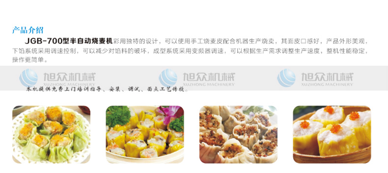 JGB-700燒麥機,采用特的設計,可以使用手工燒麥皮配合機器生產燒賣,其面皮口感好,產品外形美觀下餡系統(tǒng)采用調速控制,可以減少對餡料的破壞,成型系統(tǒng)呆用變頻器調速,可以根據生產需求調整生產速度,整機性能穩(wěn)定操作更簡單