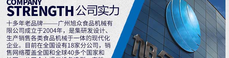 廣州旭眾食品機械有限公司是一家集科研開發(fā),生產(chǎn)設(shè)計,營銷服務(wù)為一體的現(xiàn)代化生產(chǎn)企業(yè)?,F(xiàn)代化生產(chǎn)車間,精湛制造技術(shù),所產(chǎn)機械歷經(jīng)市場重重考驗,不斷贏得海內(nèi)外客戶的贊譽。