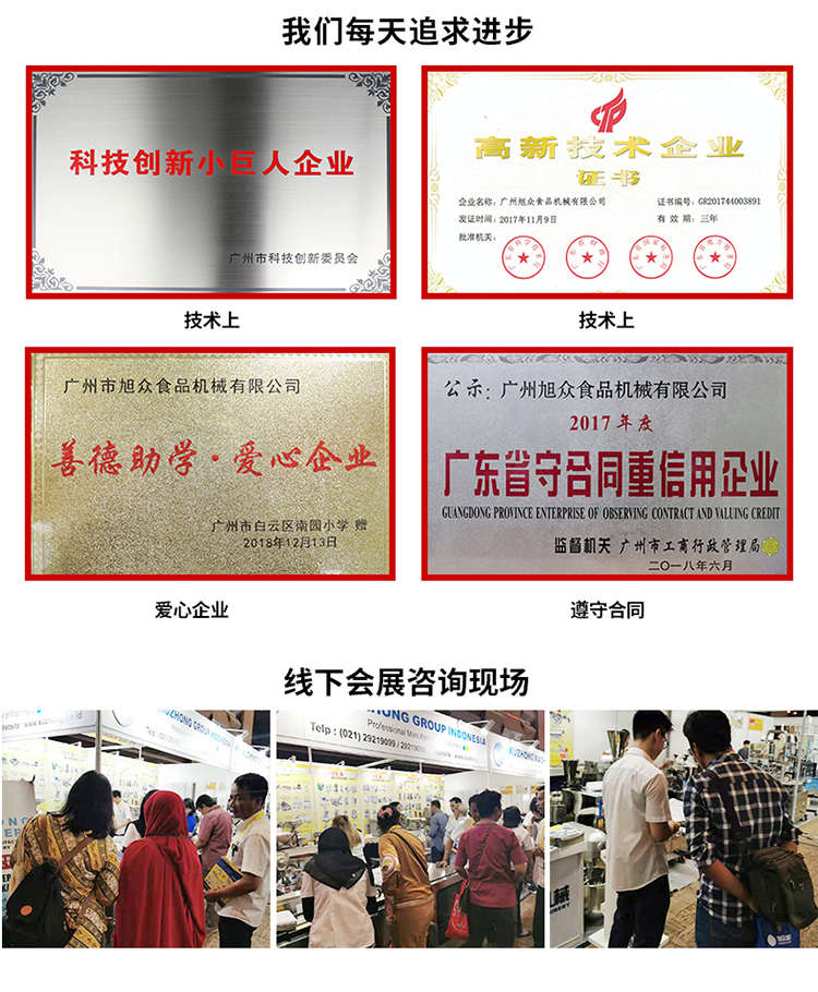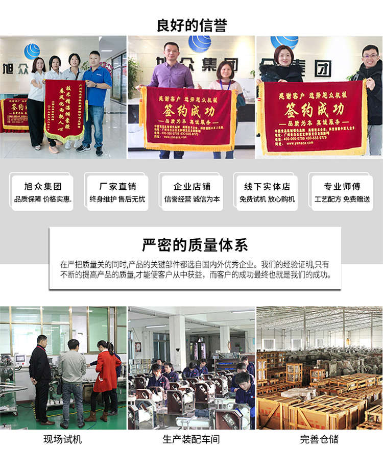 廣州旭眾食品機(jī)械有限公司是一家集科研開(kāi)發(fā),生產(chǎn)設(shè)計(jì),營(yíng)銷(xiāo)服務(wù)為一體的現(xiàn)代化生產(chǎn)企業(yè)?,F(xiàn)代化生產(chǎn)車(chē)間,精湛制造技術(shù),所產(chǎn)機(jī)械歷經(jīng)市場(chǎng)重重考驗(yàn),不斷贏得海內(nèi)外客戶的贊譽(yù)。