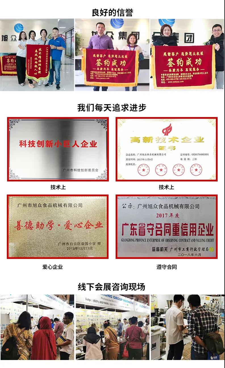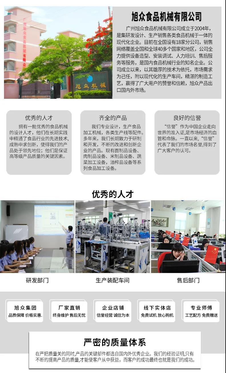 廣州旭眾食品機械有限公司是一家集科研開發(fā),生產(chǎn)設(shè)計,營銷服務(wù)為一體的現(xiàn)代化生產(chǎn)企業(yè)?,F(xiàn)代化生產(chǎn)車間,精湛制造技術(shù),所產(chǎn)機械歷經(jīng)市場重重考驗,不斷贏得海內(nèi)外客戶的贊譽。