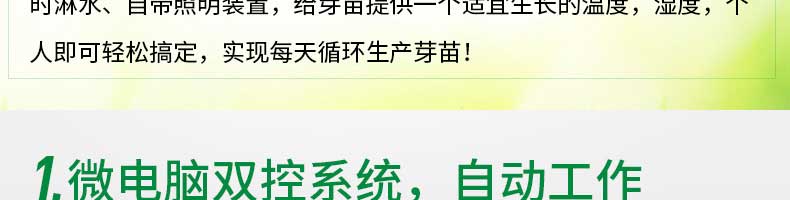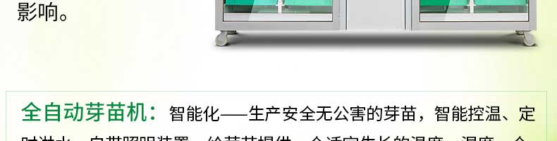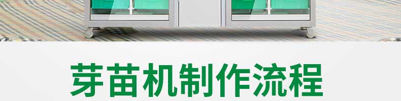 芽苗機(jī)系列,全自動芽苗機(jī):智能化一生產(chǎn)安全無公害的芽苗,智能控溫、定時(shí)淋水、自帶照明裝置,給芽苗提供一個(gè)適宜生長的溫度,濕度,個(gè)人即可輕松搞定,實(shí)現(xiàn)每天循環(huán)生產(chǎn)芽苗!